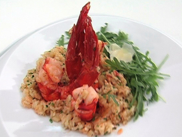 Вкусный обед из ризотто с креветками и салатом.Состав:пармезан — 200 гр;рис — 60 гр;рыбный бульон — 200 гр;рокет — 30 гр;лук — 1/2 штуки;белое вино — 20 гр;сливки — 1 столовая ложка;мускат — 1 столовая ложка;масло — 50 гр;зеленый лук — 1 столовая ложка;креветки — 3 штуки;соль, перец — по вкусу.