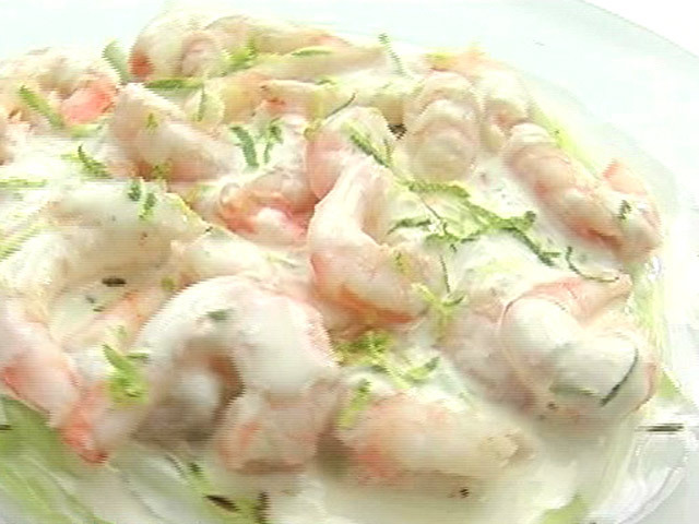 Закуска из креветок в дополнении с лаймовым соусом.Состав:креветки — 30 штук;огурец — 1 штука;лайм — 1 штука;йогурт, майонез — по 1 порции;сок лайма, белый перец, соль, тмин.